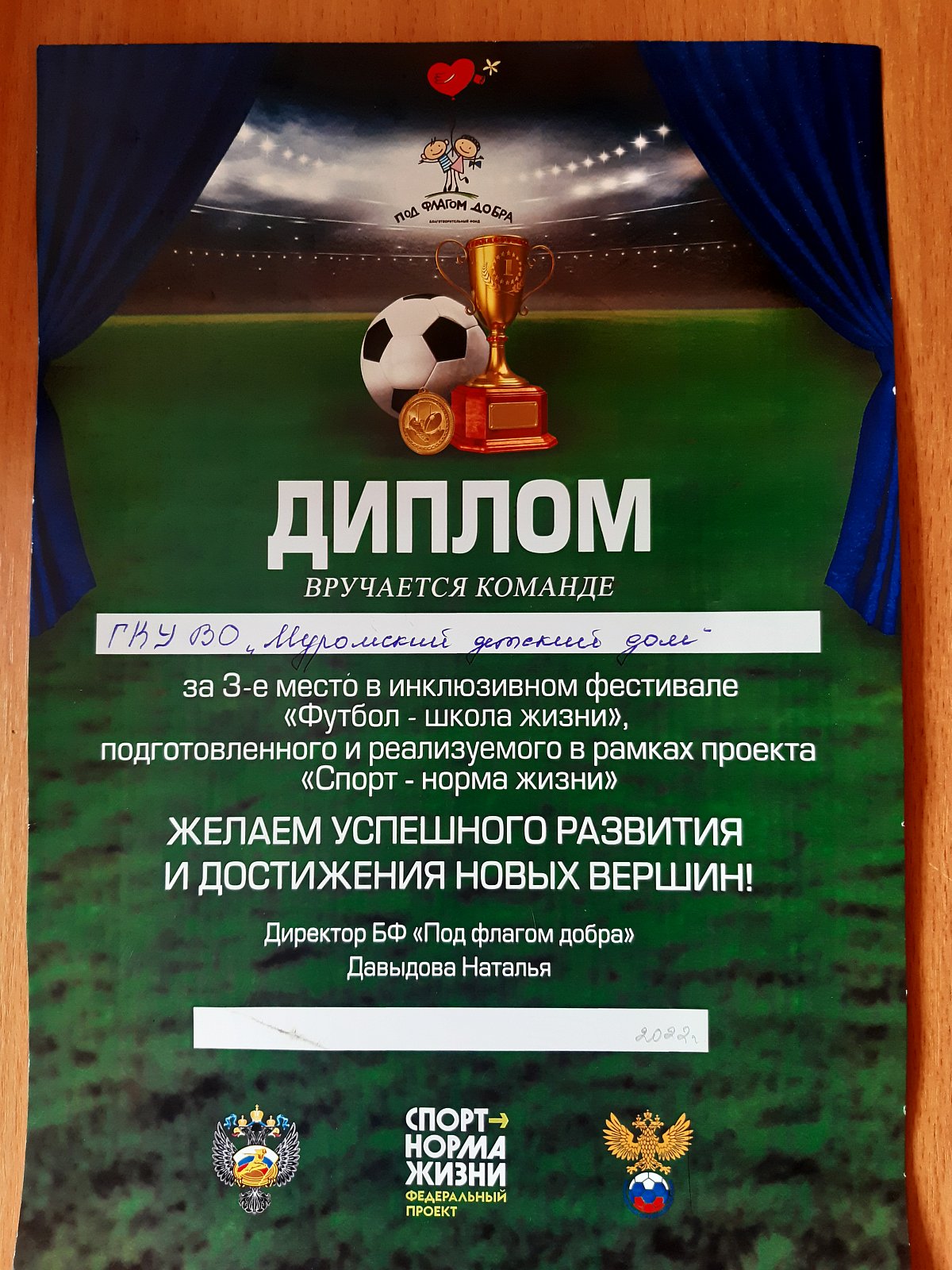 После торжественной церемонии открытия и концертной программы с участием звезд российской эстрады состоялись игры турнира в двух возрастных группах. Команда ГКУ ВО «Муромский детский дом» приняла участие в возрастной категории 2007-2009 г. р. В первой игре соревнований наши воспитанники победили соперников из г. Владимира со счетом 6:0. Во втором матче наши футболисты в упорной борьбе с соперниками из г. Гусь-Хрустальный на последней минуте игры вырвали победу 4:3. После единственного поражения от команды Лухтоновской школы-интерната наши воспитанники вновь встретилась с соперниками из г. Гусь-Хрустальный в матче за 3 место, в котором уверенно победили со счетом 4:1. Лучшим бомбардиром команды стал Горнаков Артём, забивший 10 мячей.